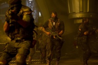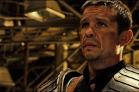 Пункт 2. Герои. Из полутора десятков персонажей (кроме Риддика) запомнилось четверо. Диас (Дэвид Батиста) своими габаритами превосходящий даже главного героя. Его командир Сантана (Жорди Молья), который непонятно как стал командиром, ибо охарактеризовать его иначе как дурак невозможно. Он постоянно орал, отдавал дурацкие приказы, в итоге получил по морде от девчонки и как бы смешно это ни звучало почти добрался до Риддика, что закончилось для него (Сантаны) не очень хорошо. Третьей у нас идет Даль (Кэти Сакхофф, известная в первую очередь по сериалу «Звездный крейсер «Галактика») которая собственно и навешала люлей Сантане. Но запомнилась в первую очередь тем, что громогласно заявила, что с мужиками не спит, а сама при первом же заигрывании со стороны Риддика только и искала случая выпрыгнуть из своей униформы. Я в принципе против ничего не имею, но логики как то не хватает, не находите? Понятно, что Риддик альфа-самец, но означает ли это, что лесбиянки должны расставлять перед ним ноги по первому же зову? Про четвертого запенившегося персонажа Босса Джонса (Мэтью Нэйбл) говорить не буду вообще, потому, как это будет спойлер, как это не удивительно.