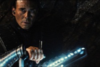 Пункт 1. Сюжет. Скажу честно исходя из рекламного ролика, не ждал чудес, но от того что все обернется, настолько тупо прямолинейно признаться несколько выпал в осадок. Заявлялось, что все вернется к истокам. В какой-то мере так оно и случилось, но я что-то сильно сомневаюсь, что истоки заканчиваются на необходимости закинуть главного героя на пустынную планету и заселить её насекомообразными чудовищами. Весь сюжет можно емко описать очень просто – Риддик с собакой VS охотники за головами VS чудовища. Все! Ни одного поворота сюжета, который бы не читался. А насколько «элегантно» было обставлено прибытие Риддика на место, так сказать действия и его последующая робинзонада это отдельный разговор. Я серьезно, на протяжении двадцати минут хронометража Ричард Б. Риддик самозабвенно приключался в полном одиночестве, не считая волчонка прибившегося к нему да прочей на этот раз не особо дружелюбной фауны.