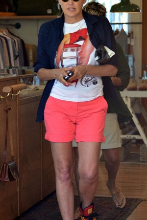 Для похода по магазинам актриса выбрала стильные яркие шорты, трендовый топ, синюю рубашку вместо пиджака и модные сникерсы.
