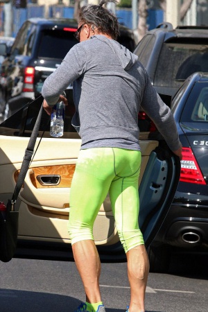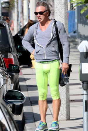 На днях папарацци застукали Микки возле входа в спортзал. Занятия спортом – вещь полезная и похвальная, особенно в 61 год. Но вот одежда актера явно не соответствовала его возрасту, статусу и даже полу. Рурк следовал на тренировку в… обтягивающих ярко-салатовых лосинах. В дополнении с серой майкой с глубоким V-образным вырезом получилось очень эффектно.