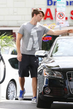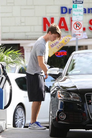 Фотографы подстерегли Патрика в субботу на автозаправке, где он заливал бензин в свой автомобиль. Юноша был одет в широкие шорты и просторную футболку, под которой едва угадывались его мускулы.