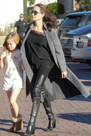 Энджи выглядела потрясающе в стильных черных кожаных штанах, заправленных в высокие черные кожаные сапоги, которые подчеркнули ее тонкий стан. Свой образ кинодива дополнила серым пальто и черной туникой.