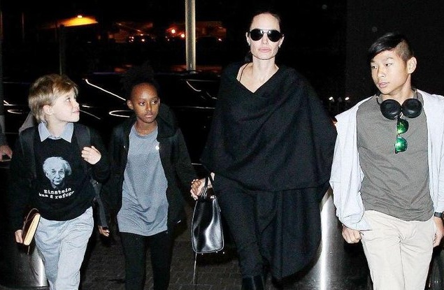 Папарацци подловили худощавую и бледную Джоли с детьми в аэропорту. Актриса с головы до ног была одета в черное. Особое внимание журналистов привлекла дочь звезды Шайло: на девочке была толстовка с портретом Альберта Эйнштейна с надписью "Эйнштейн был беженцем".