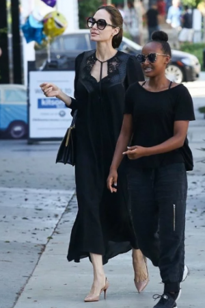 Для прогулки с детьми Анджелина выбрала черное элегантное платье с длинными рукавами. Хотя платье было объемным – можно заметить, как похудела актриса.