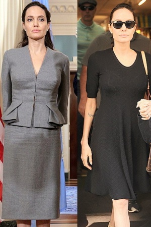 Однако, звезда поспешила опровергнуть домыслы интересующихся. Анджелина Джоли появилась в госдепартаменте США в приталенном сером костюме, подчеркивающем ее грудь и округлые бедра.