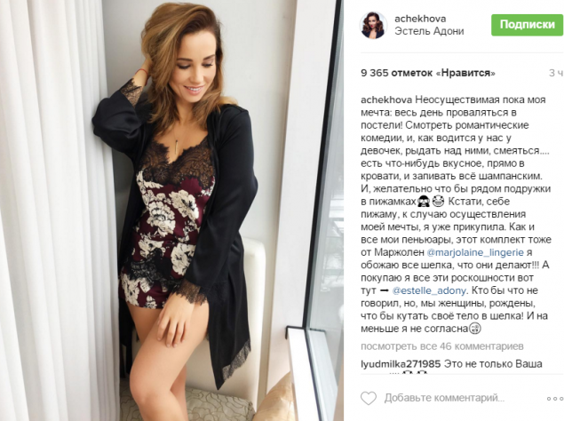"Неосуществимая пока моя мечта: весь день проваляться в постели. Смотреть романтические комедии, смеяться и рыдать над ними. Есть что-то вкусное прямо в постели и запивать шампанским", - подписала снимок Чехова.