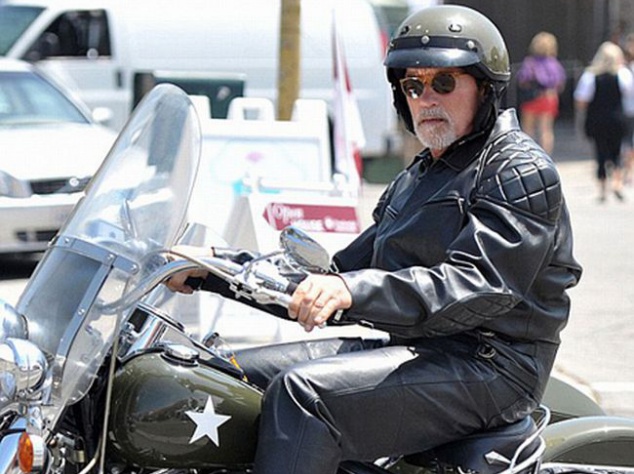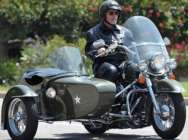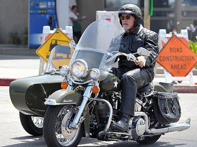 Арнольд Шварценеггер в новом образе раскатывает по городу, взгромоздившись на любимый мотоцикл с коляской.