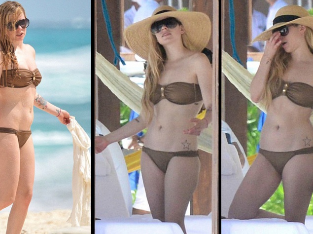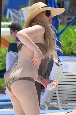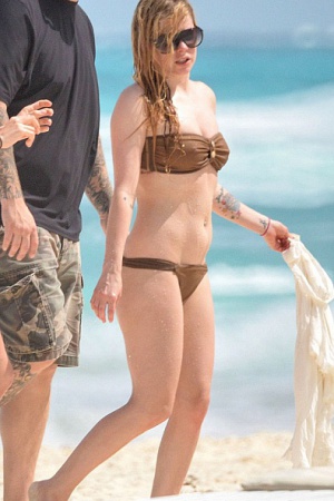 Папарацци застали певицу во время купания в заливе. Аврил выбрала для выхода на пляж бикини бронзового цвета и широкополую соломенную шляпу. Стоит отметить, что после замужества фигура певицы не изменилась и осталась, как и прежде, весьма привлекательной для мужского взгляда.