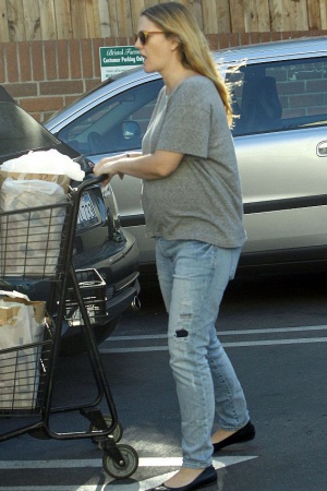 Фигура актрисы так округлилась, что даже просторная футболка не может скрыть изменений.
