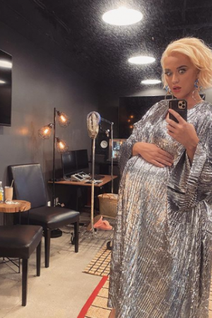 Кэти Перри встала на высокие каблуки — несмотря на последние недели беременности — и спрятала живот в просторном платье, будто сделанном из фольги.