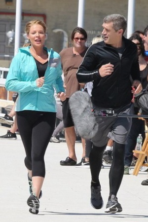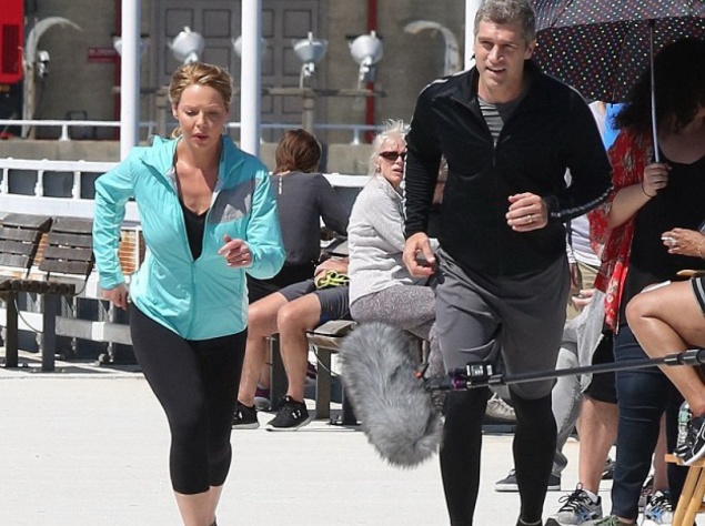Кэтрин Хайгл прикрыла округлившийся животик голубой спортивной курткой на съемках сериала Doubt (рус. – Сомнение) в Нью-Йорке, США. По сценарию ее героине нужно было совершить пробежку по набережной реки Гудзон.