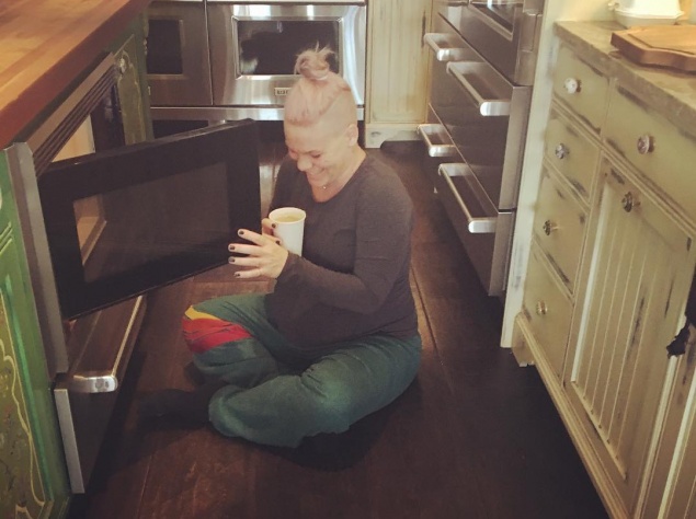 "Когда вы разогреваете ваш кофе без кофеина есть повод, чтобы посидеть на полу и отдохнуть некоторое время", - подписала свою публикацию Пинк.
