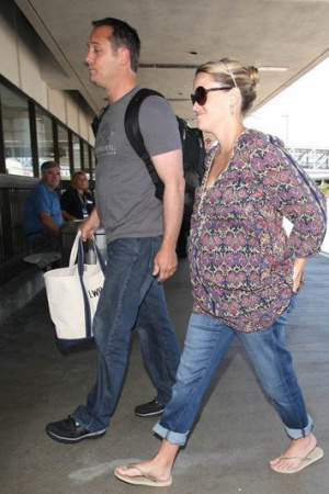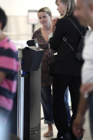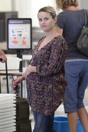 Беременная и очень округлившаяся Риз Уизерспун была поймана ушлыми папарацци в аэропорту Лос-Анджелеса. 15 июля актриса в компании мужа Джима Тота покидала это солнечный калифорнийский город. Риз, одетая в пеструю блузку свободного покроя и джинсы, нашла в себе силы улыбнуться фотографам.