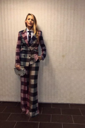 Так, на днях на официальной страничке Лайвли в Instagram появились новые фотографии, на которых звезда предстала в экстравагантном наряде: броский клетчатый костюм с расклешенными брюками и в галстуке.