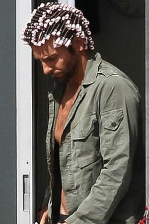 Актер вышел на балкон своего отельного номера в Бостоне, где сейчас задействован в съемках нового фильма Дэвида О. Рассела. На голове у Купера красовались десятки тонких бигуди розового цвета. Эта прическа опытной домохозяйки очень контрастировала с обнаженной мужественной грудью, которую он продемонстрировал, не застегнув рубашку.