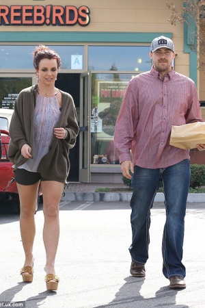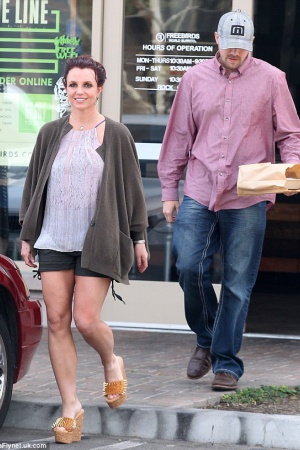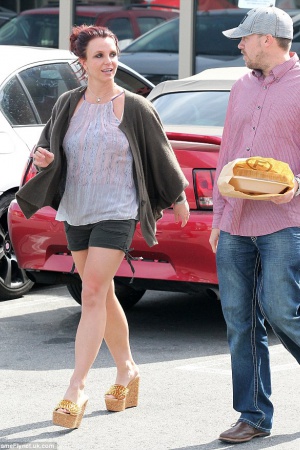 Бритни надела женственный полупрозрачный топ без рукавов, короткие спортивные шорты с накладными карманами и завязками по бокам и необычной формы темно-коричневый кардиган. Дополнила этот наряд звезда золотистым шлепанцами на танкетке, прической из наспех заколотых волос и фирменным расплывшимся макияжем.