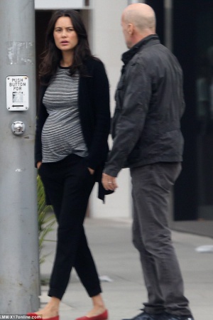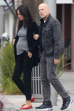 На днях Уиллис вышел на прогулку с супругой и папарацци зафиксировали, как он заботливо переводит ее через дорогу, держа под руку. Фигура Хеминг уже заметно округлилась, и просторный топ не мог этого скрыть.