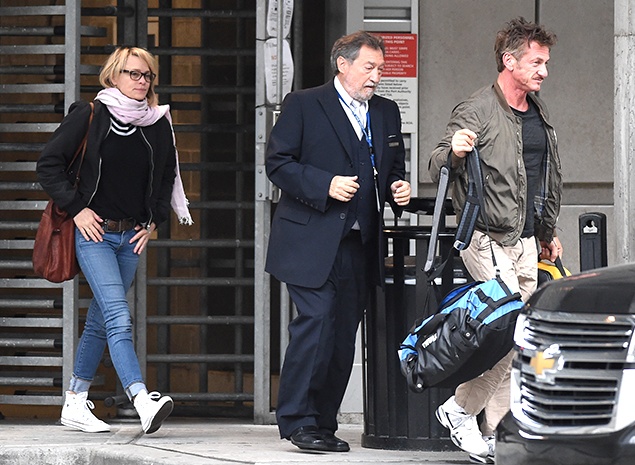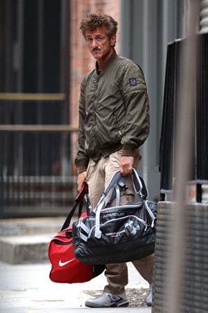 Шон Пенн, который шел впереди экс-жены, нес их сумки к машине. На нем были надеты светлые брюки, темно-зеленая ветровка и черная майка.