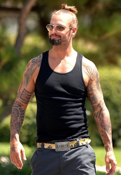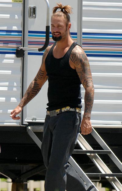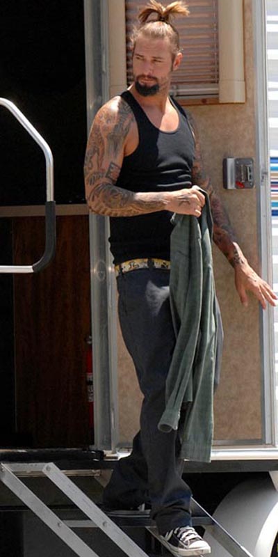Холлоуэй играет художника по татуировкам, отсюда такой богатый декор рук. Отвечает ли его прическа какому-то замыслу авторов картины или просто в Калифорнии ужасно жарко, узнаем, когда фильм выйдет на экраны.