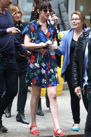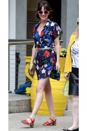 На днях в Нью-Йорке папарацци запечатлели актрису во время подготовки к съемочному процессу. Дакота появилась на публике в ярком цветастом платье, чем невероятно порадовала своих поклонников, ведь обычно в одежде актриса отдает предпочтение черно-белой палитре. Стильные очки и босоножки удачно дополнили образ Джонсон, однако, главным украшением стала улыбка актрисы, которая не сходила с ее лица.