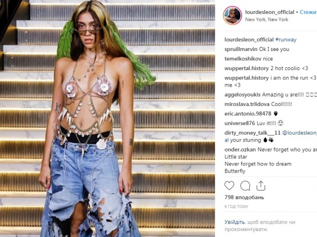 Однако образ, в котором дочь Мадонны появилась на подиуме Недели моды, шокировал публику. Лурдес появилась в джинсах over-size, надетых поверх бикини, а также странный топ из цепочек с ракушками, который едва прикрывал грудь.