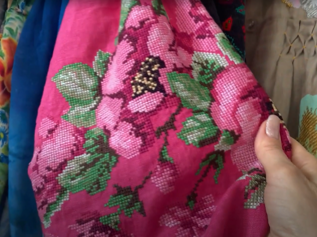 В гардеробе Сумской присутствуют сорочки и платья разных цветов: и оранжевые, и малиновые, и голубо-серые. Здесь также есть старинные вышиванки, такие как рубашка-румынка, сделанная из конопляного полотна.