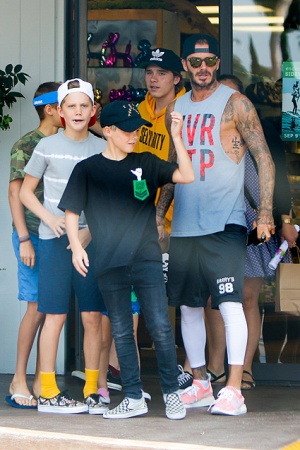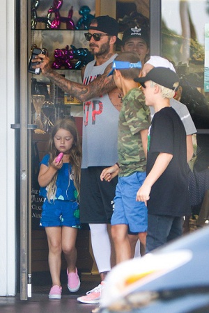 Образцовый отец Дэвид вместе со своими сыновьями и дочкой отправился на завтрак в один из ресторанов Лос-Анджелеса, после выхода из которого и столкнулся с фотографами. Но если раньше все внимание было бы приковано к отцу семейства, то сейчас общественность намного больше волнует младшее поколение Бекхэмов.