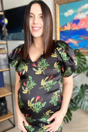 Не так давно беременная звезда показалась в легком голубом мини-платье, а сейчас предстала в черном шелковом платье с ярким принтом.