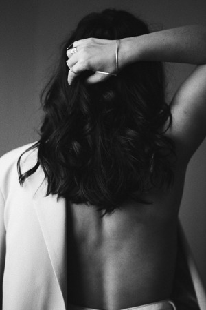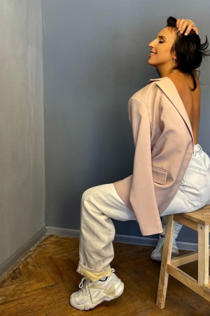 Звезда надела пиджак пудрового цвета на голое тело и пикантно позировала фотографу.