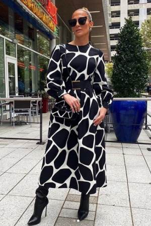 Певица подобрала черно-белое платье с принтом жирафьего окраса от Valentino с длинным рукавом длины миди. Образ Лопес дополнила массивным поясом на талии с золотой пряжкой, высокими черными сапогами на шпильке, массивными круглыми сережками и большими черными очками.