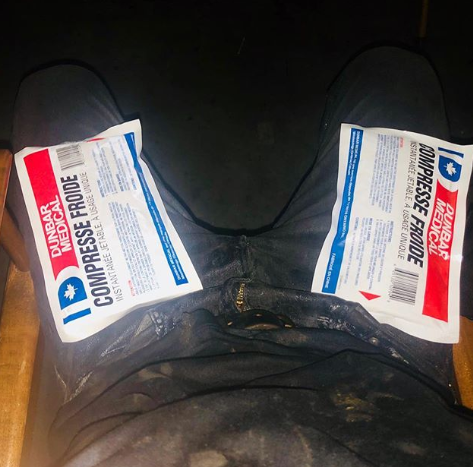На снимке МакЭвой запечатлен сидящим с компрессами на ногах.