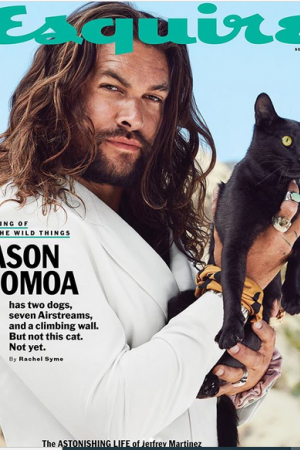 Так, на обложке нового выпуска издания Момоа в белом пиджаке держит на руках черную кошку. "Король диких вещей" - написано в заголовке к интервью с актером.