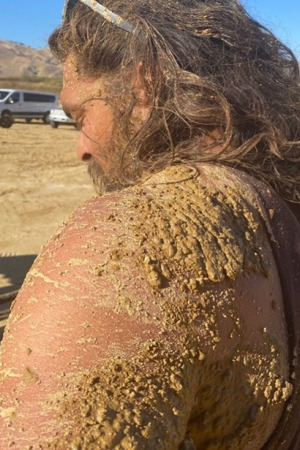 На кадрах Момоа запечатлен в некогда белых штанах и темной майке. При этом актер с головы до пят измазался в грязи.