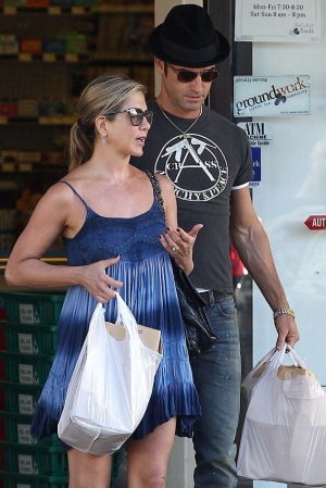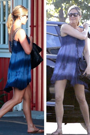 На выходных 44-летняя актриса отправилась со своим женихом Джастином Теру за покупками в продуктовый магазин, но выбрала для этого выхода очень нарядное платье. На Джен красовалось легчайшее коротенькое синее платьице, окрашенное с эффектом омбре, которое открывало стройные ноги своей хозяйки.
