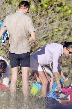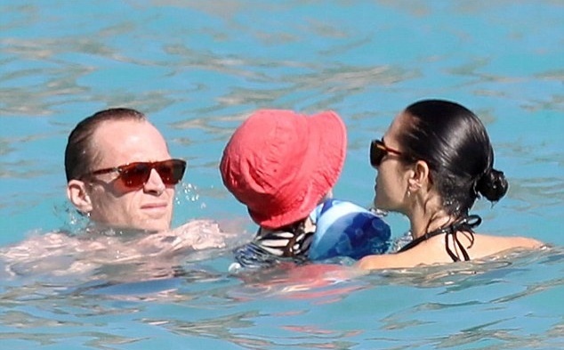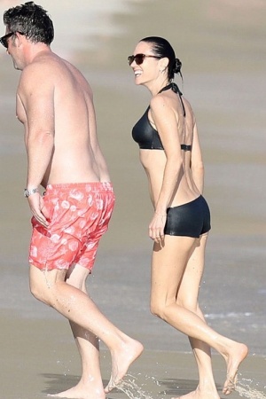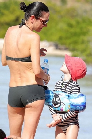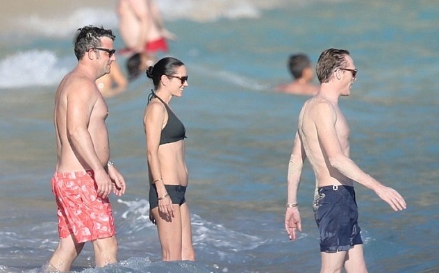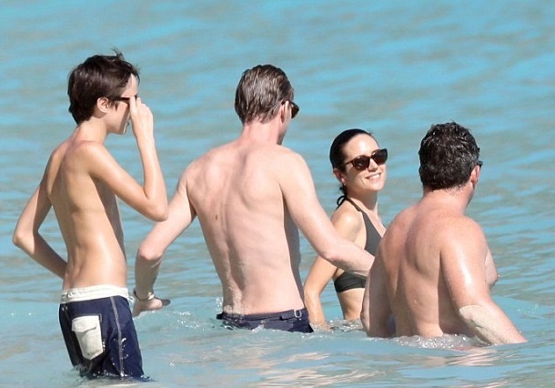 Пара резвилась со своими детьми — 5-летней Агнес и 13-летним Стелланом. Джен продемонстрировала подтянутую фигуру, выбрав черный раздельный купальник.
