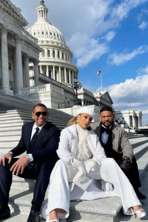 Певица позировала в белоснежном наряде от Chanel, который выбрала для своего выступления на торжественной инаугурации президента США. Возлюбленный Лопес выбрал для важного дня классический костюм в полоску.