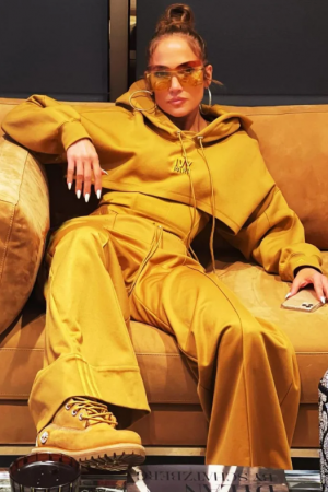 Линию спортивной одежды артистка запустила еще в 2016 году. Лопес примерила костюм медового цвета, состоящий из укороченной толстовки и расклешенных брюк.