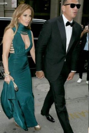Для торжества Джей Ло выбрала вечерне платье изумрудного оттенка с пикантным декольте и высоким воротом от Hamel, стоимостью 1160 евро.