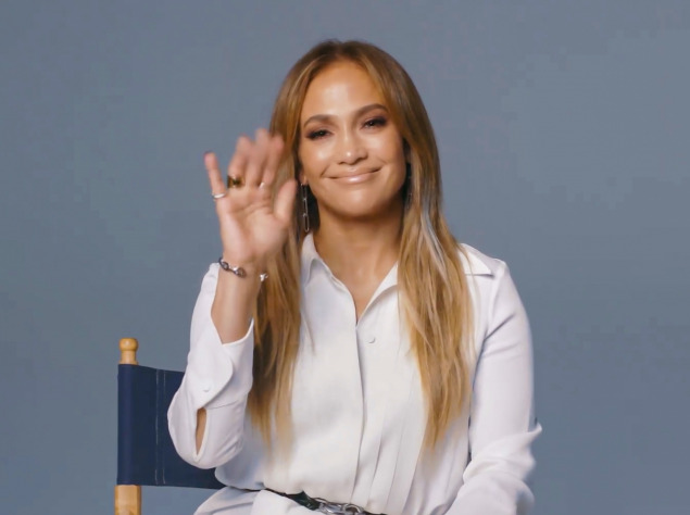 На связь вышла Дженнифер Лопес, которая выступила с речью. Она предстала на экране в белой рубашке с черным поясом на талии.
