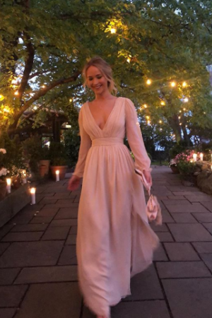 Наряд Дженнифер Лоуренс напоминал предсвадебный. К гостям актриса вышла в вечернем светлом платье от бренда L.Wells. Образ звездной невесты дополнили туфли от Casadei, сумка от Roger Vivier и драгоценности от Fred Leighton.