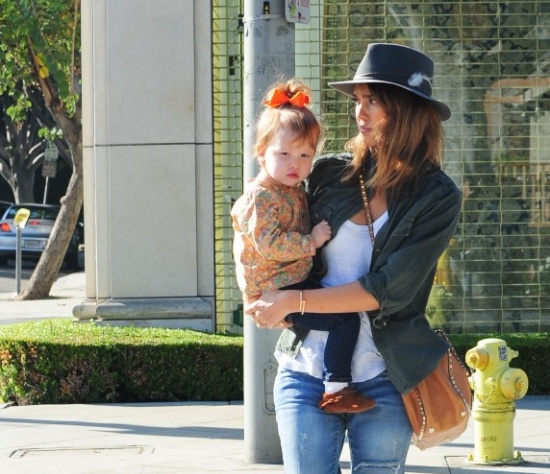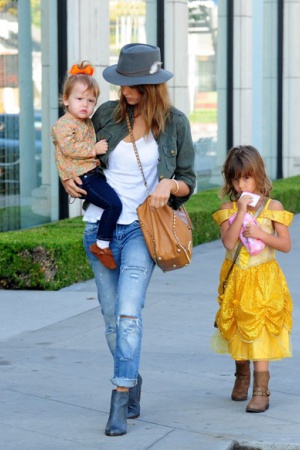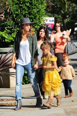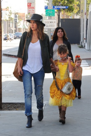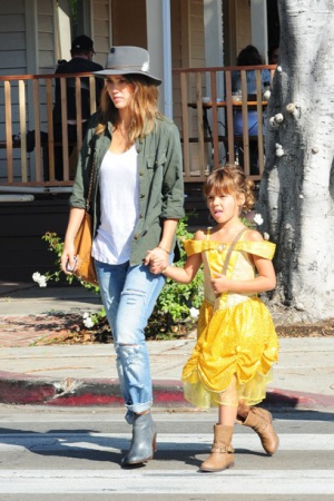 Милейшее семейство недавно засняли фотографы в Лос-Анджелесе – Джессика Альба вышла в город, позавтракать со своими чудными дочурками Онор и Хэвен. Конечно, самой заметной в маленькой компании была 5-летняя Онор, которая была одета в яркое платьице Бэль из диснеевской "Красавицы и чудовища". При этом, девичий наряд был скомбинирован с грубыми сапогам и, похожими на ковбойские – получился сказочно стильный образ.