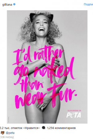 Американская актриса Джиллиан Андерсон снялась обнаженной ради защиты животных. Снимок артистки приурочен к акции организации PETA по защите пушных зверей.