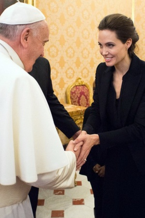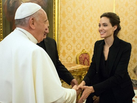 Голливудская актриса и режиссер Анджелина Джоли удостоилась чести встретиться с лидером католической церкви Папой Франциском. Встреча прошла во вторник, 6-го января в Риме, куда Джоли приехала презентовать свою режиссерскую работу – "Несломленный". Ранее говорилось, что компанию Анджелине составит ее супруг Брэд Питт, но его на встрече не было. 39-летняя Энджи была счастлива встретиться с Папой Франциском, о чем свидетельствовала широкая улыбка на ее лице.