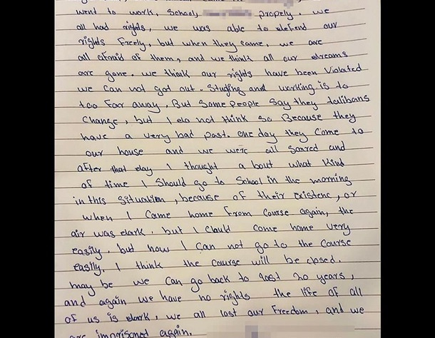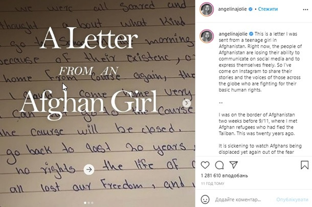 Джоли разместила письмо афганской девушки-подростка, в котором говорится об изменениях в жизни общества в связи с приходом к власти движения "Талибан".