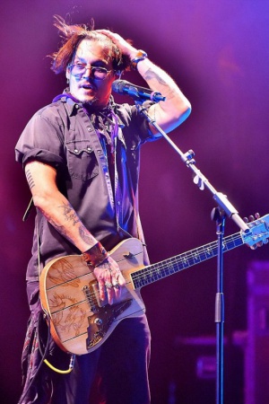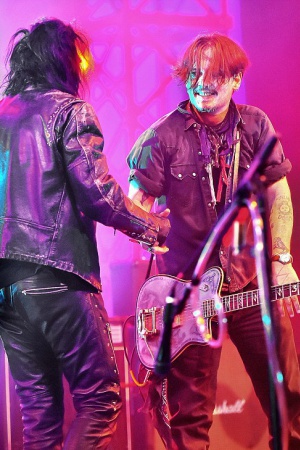 Голливудский актер в компании Элиса Купера вышел на сцену концерта католической средней школы. Поддержать своего возлюбленная пришла Эмбер Хёрд.