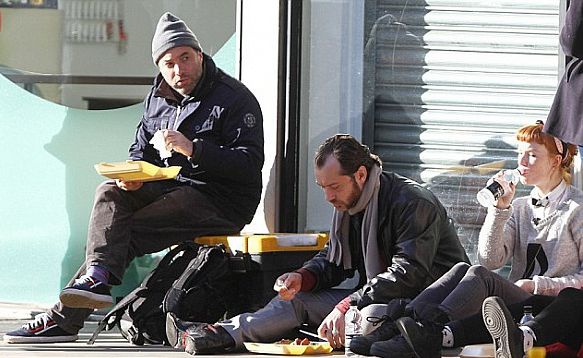 Джуд Лоу, который сейчас снимается в черной комедии "Дом Хэмингуэй", совсем забыл о своем звездном статусе. Актера сфотографировали в обеденный перерыв, сидящим прямо на асфальте. Лоу пренебрег своим правом перекусить в комфортном трейлере или в ближайшей забегаловке. Прихватив свой ланч-бокс, он умостился рядом с членами съемочной группы. Со стороны эта картина напоминала группу бездомных, раздобывших себе еды.