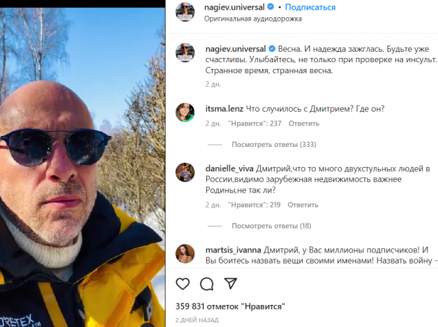 Подписчики из страны-захватчицы обвинили актера в сиденье на двух стульях и поинтересовались, где он сейчас находится: "Дмитрий, что-то много двухстульных людей в России, пожалуй, зарубежная недвижимость важнее Родины, не правда ли", "Безпозвоночный. И вашим и нашим. Хотите так спляшем, хотите так спляшем. Разочаровал".