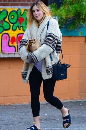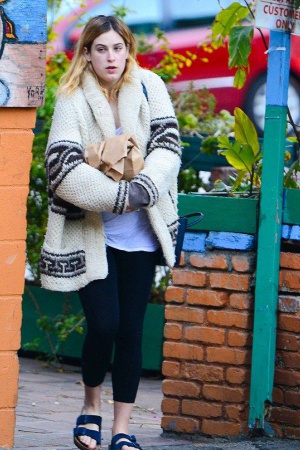 Звездная дочь нарядилась в необъятного размера кардиган, чтобы укутаться в него от зимней прохлады, но при этом обулась в сандалии. Под теплую одежду девушка нацепила растянутую майку, которая ее заметно полнила. А с волосами Скаут творилось вообще нечто невероятное – ее прическа выглядела не просто неаккуратной. Волосы явно умоляли хотя бы вымыть их, не то что расчесать. Не красили девушку и упомянутые сильно отросшие корни. Неужели она вслед за матерью решила пуститься во все тяжкие? Но ведь Деми, даже будучи немного не в себе, следит за своим внешним видом!