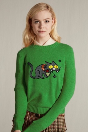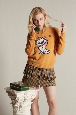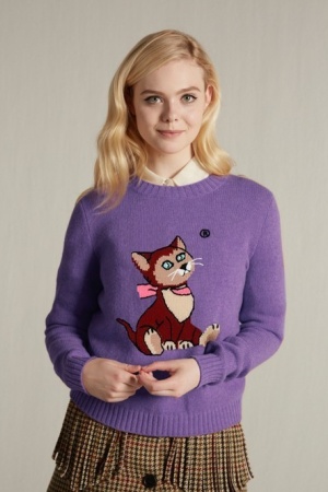 В новой фотосессии Эль Фаннинг позирует в трех свитерах разных цветов: в оранжевом с изображением кошки Мари из диснеевского мультфильма "Коты-аристократы", фиолетовом с Диной из "Алисы в Стране Чудес" и в зеленом свитере, на котором кот Снежок из "Симпсонов" избавляется от комочка шерсти. Вся коллекция выполнена из дорогостоящей шерсти с Шетландских островов, а цена каждого свитера составляет 1295 долларов.