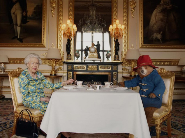 Также во время чаепития в гостиной Виндзорского замка Паддингтон поздравил королеву Елизавету II с 70-летием ее правления, пожелал "счастливого юбилея", и поблагодарил "за все". Озвучил персонажа британский актер Бен Уишоу.